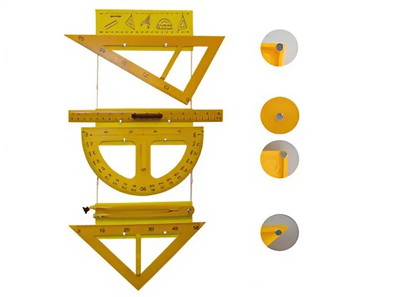 Инструменты изготовлены из пластмассы, снабжены ручками и магнитными держателями для фиксации при черчении и измерении на классной доске. Комплект крепится на стене на пластинах, соединенных между собой гибкой декоративной связью и оснащенных удобными держателями
