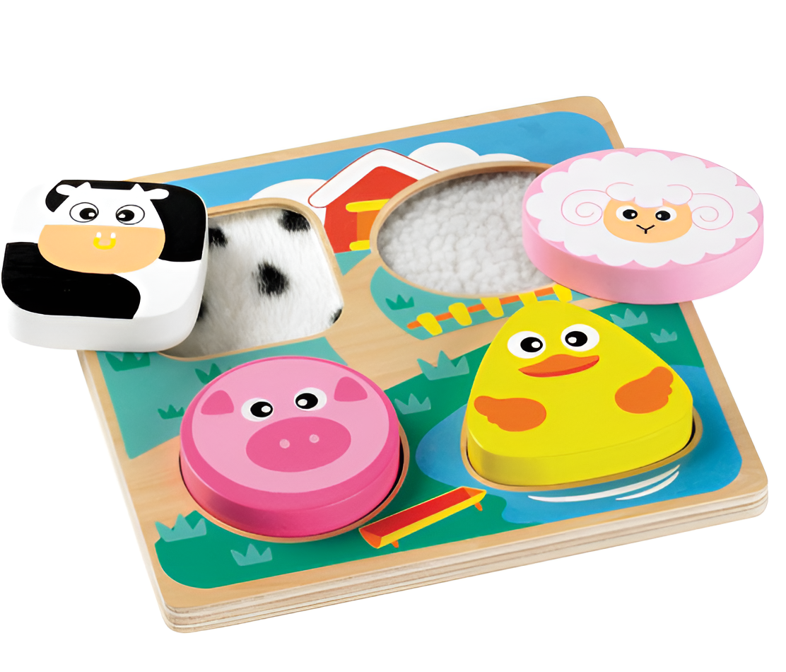 Тактильные пазлы для незрячих и слабовидящих детей. Сами пазлы выполнены из дерева. А места, куда пазлы вставляются, выполнены из различных на ощупь материалов.