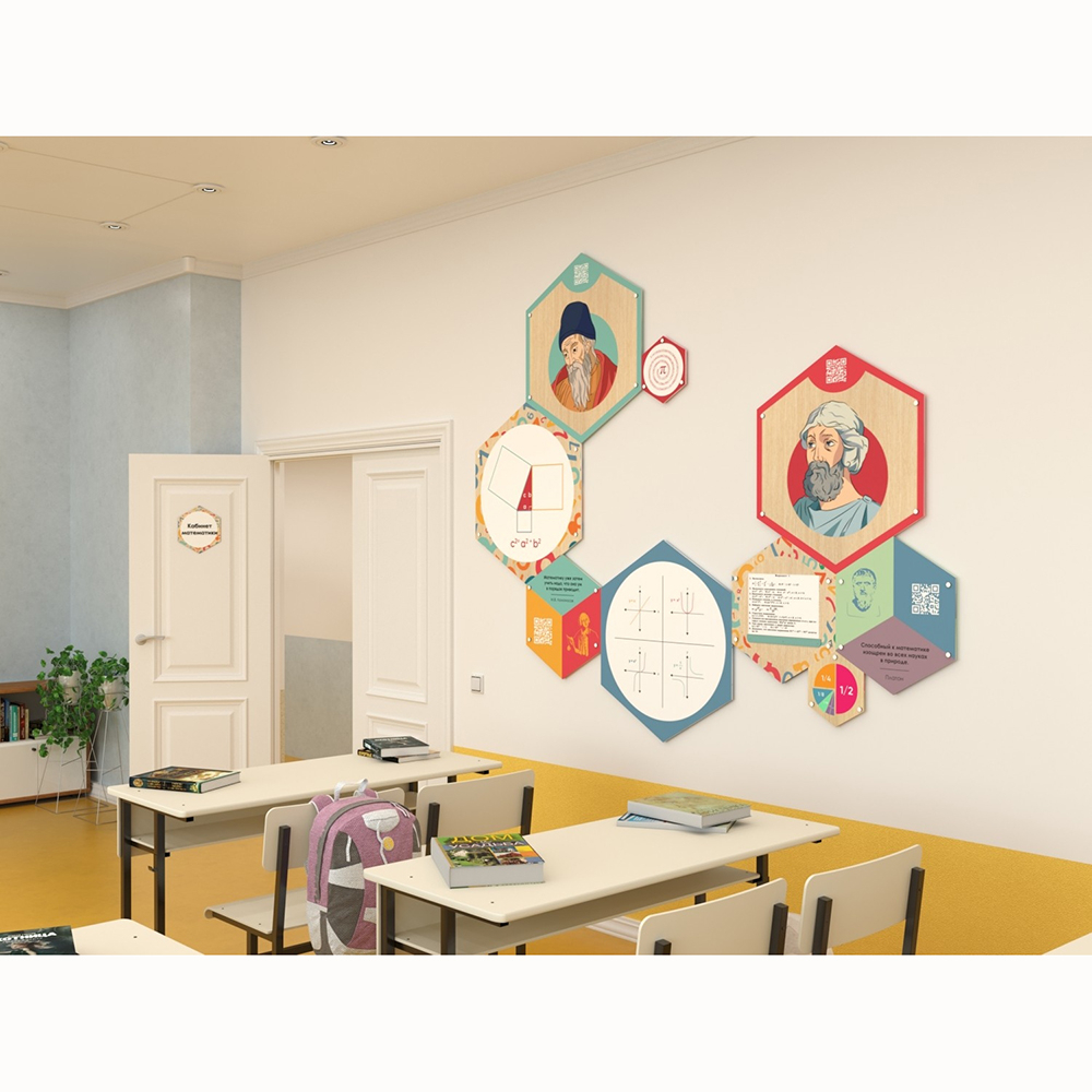 Каждый шестигранник содержит обучающую информацию: портреты выдающихся людей, их достижения и великие цитаты, основные постулаты науки, формулы, графики, теоремы. Благодаря qr-кодам дети могут подробнее узнать об учёных, изображённых на портретах, стоит только навести на них телефон.